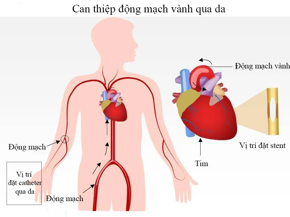 Can thiệp động mạch vành qua da (Percutaneous Coronary Intervention - PCI) là một phương pháp điều trị bệnh mạch vành ít xâm lấn. Thủ thuật này được thực hiện bằng cách đưa một ống thông (catheter) nhỏ vào động mạch ở đùi hoặc cổ tay, sau đó luồn dây dẫn qua tổn thương (chỗ hẹp hoặc tắc) trong động mạch vành. Tiếp theo, bác sĩ sẽ đưa bóng và stent lên để nong rộng chỗ hẹp hoặc tắc, và đặt stent để giữ cho lòng mạch được lưu thông.