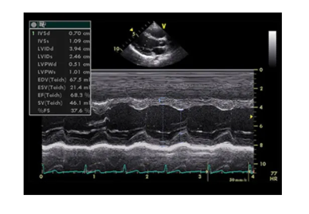 - Đo đường kính thất trái cuối tâm trương (LVIDd) và cuối tâm thu (LVIDs): Từ đó tính toán chức năng tâm thu thất trái (EF - Ejection Fraction).